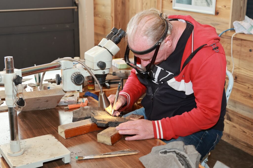 Eindrucksvoll wurde dies von einem Sammler aus Kärnten dem Publikum demonstriert. So mancher war erstaunt darüber, dass beim Auffinden meist nur ein Steinbrocken mit einem winzigen Teilchen des Sauriers sichtbar ist, keinesfalls ein „kompletter Saurier“. Dieser muss in mühevoller Arbeit unter dem Mikroskop und mit dem nötigen Fachwissen freigelegt werden. Eine Präparation nimmt oft mehrere Monate und sogar Jahre in Anspruch.