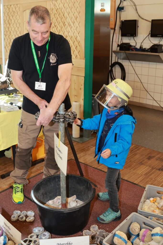 Wer zu Hause Mineralien hat, die er nicht kannte, fand fachkundige Hilfe am Mineralienbestimmungsstand. Beim beliebten Geodenknacken offenbarten Achatkugeln ihr wunderschönes Innenleben in Form von feinen Kristallen.
